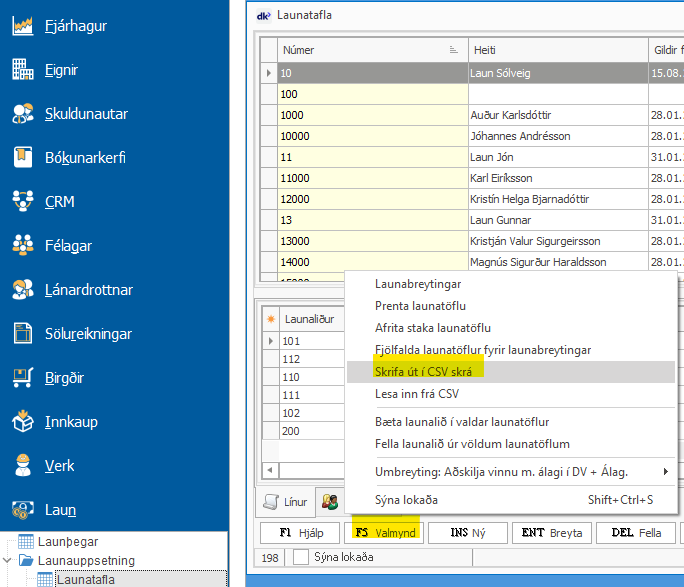 launabreytingum eða skrifa launatöflur út í csv skrá.