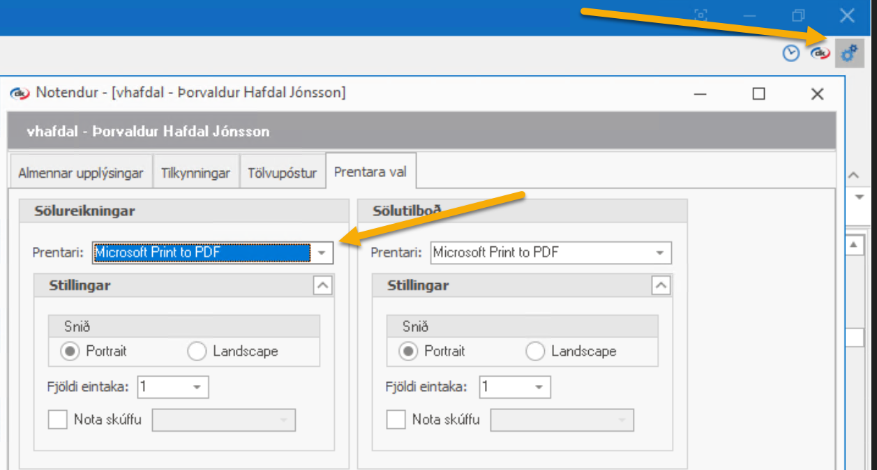 Smellið á tannhjólin og við það opnast gluggi þar sem hægt er að velja réttann prentara fyrir sölureikninga.