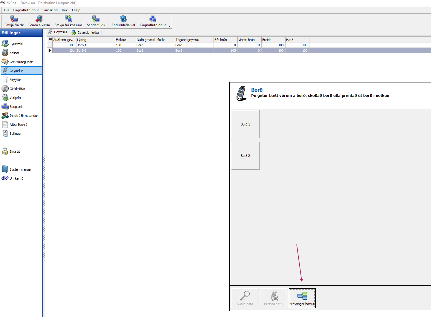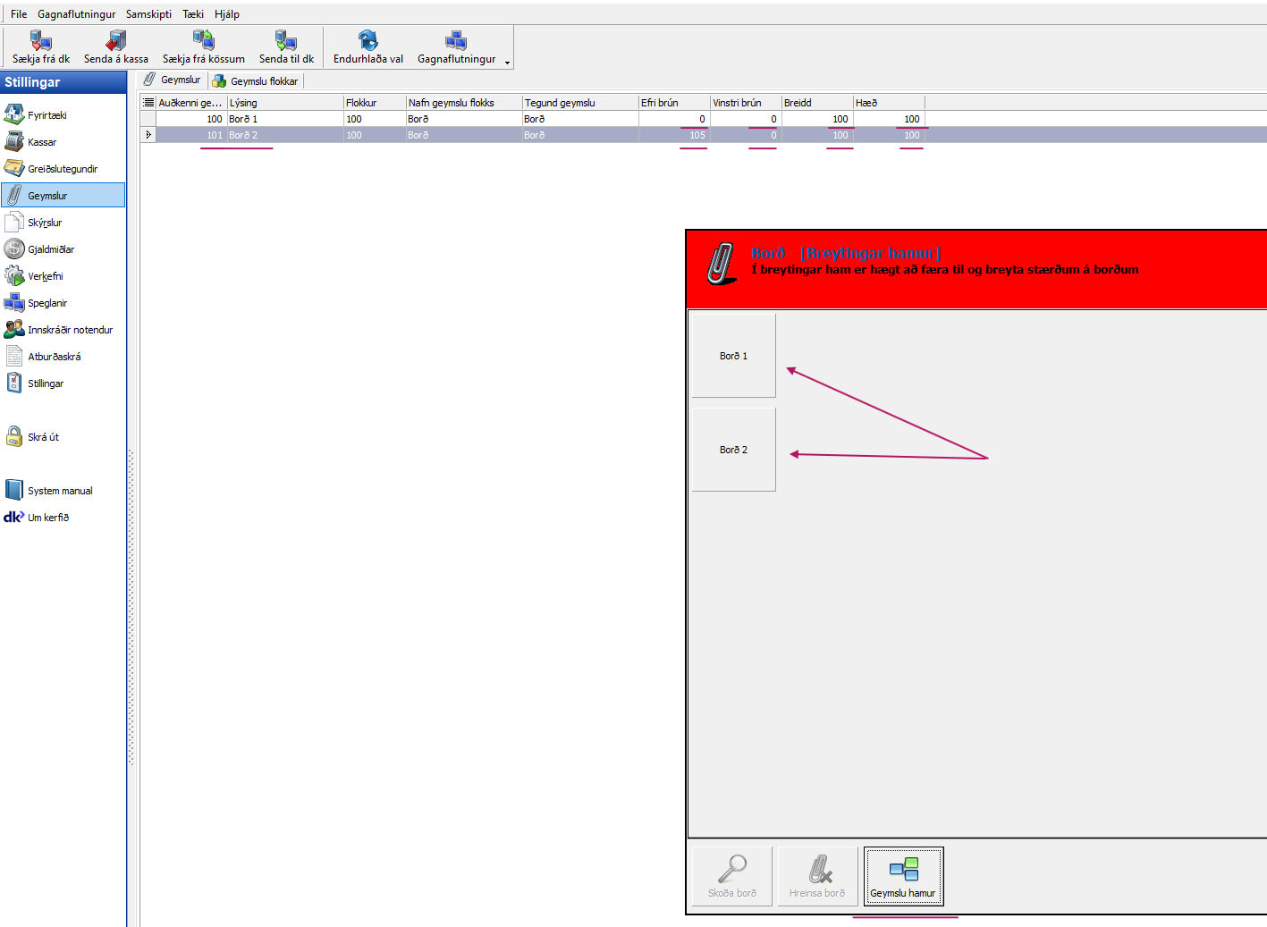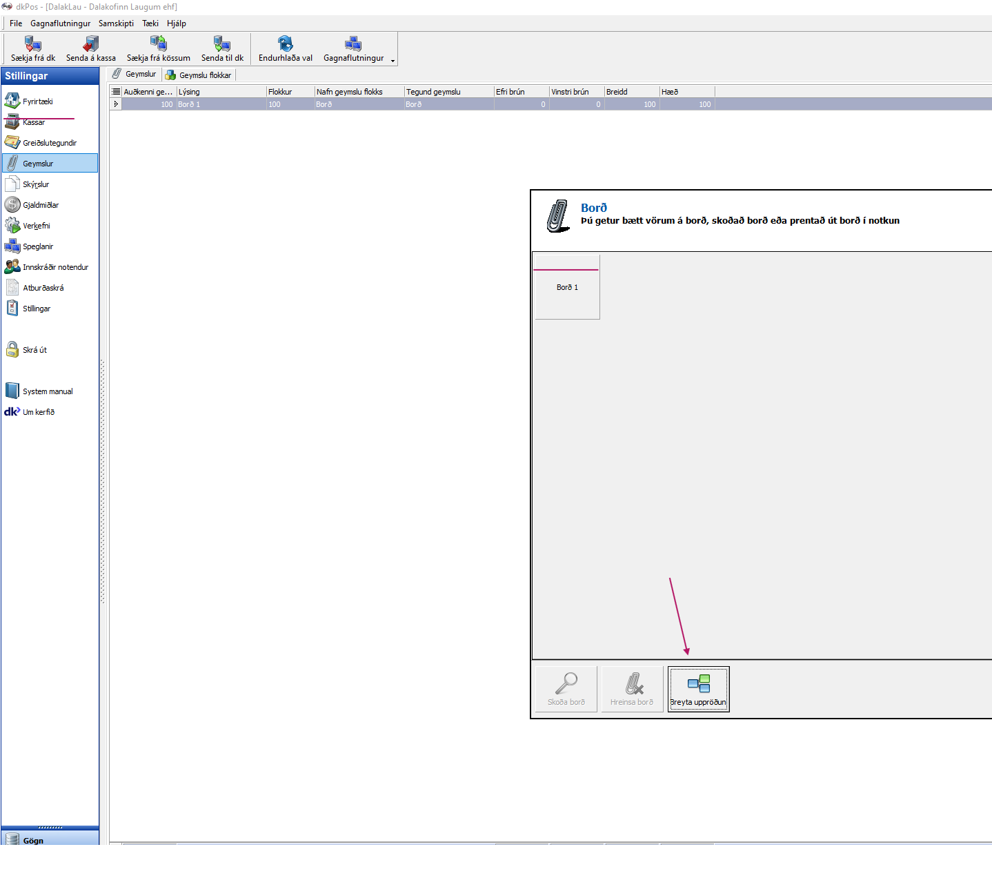 Auðkenni geymslu fyrir hvert borð þarf alltaf að vera sérstakt 100 fyrsta borð, næsta borð 101 o.s.f.r.v svo lýsing ,,Borð 1"