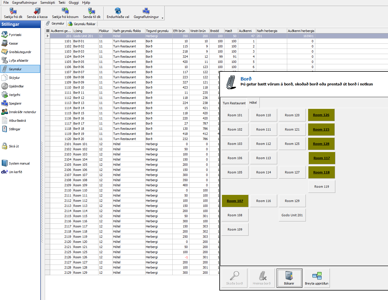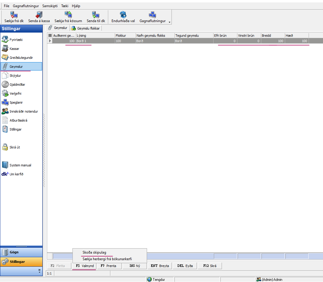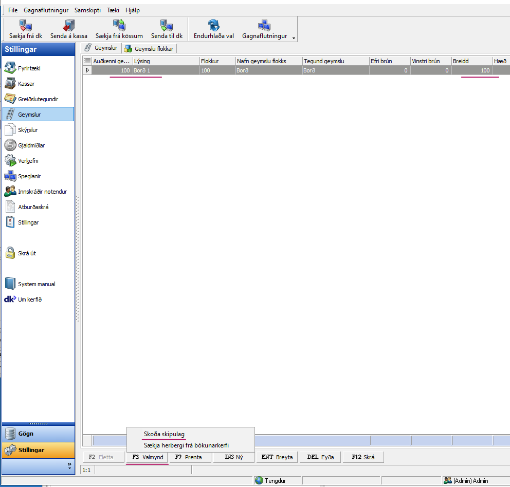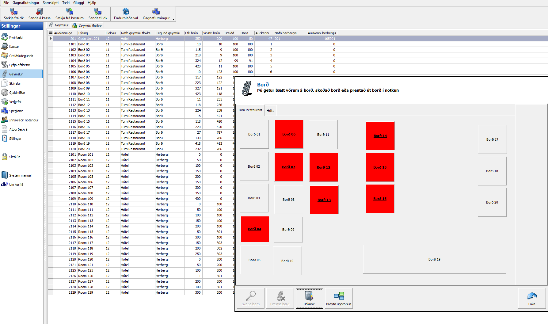 Auðkenni geymslu fyrir hvert borð þarf alltaf að vera sérstakt 100 fyrsta borð, næsta borð 101 o.s.f.r.v svo lýsing ,,Borð 1"