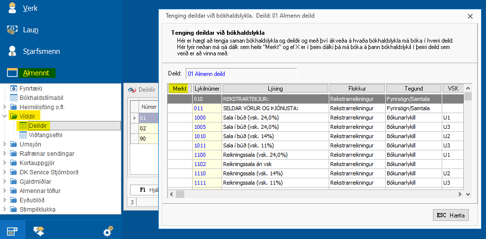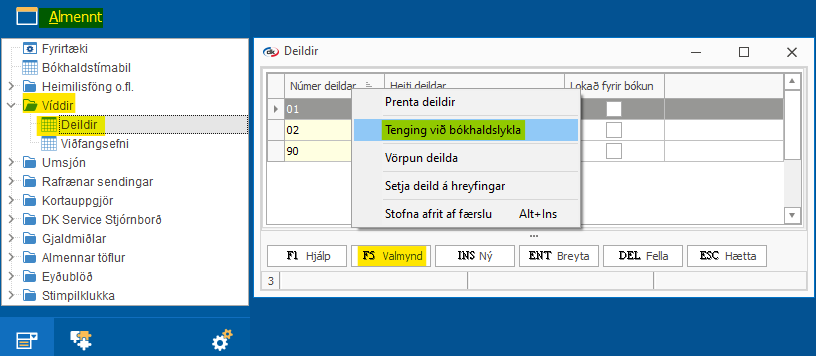 Almennt > Víddir > Deildir > Hafa deildina valda sem bæta á við tengingu bókhaldslykla > F5 Valmynd > Tenging við bókhaldslykla > Merkja þarf við þá bókhaldslykla sem bóka má umrædda deild á.
