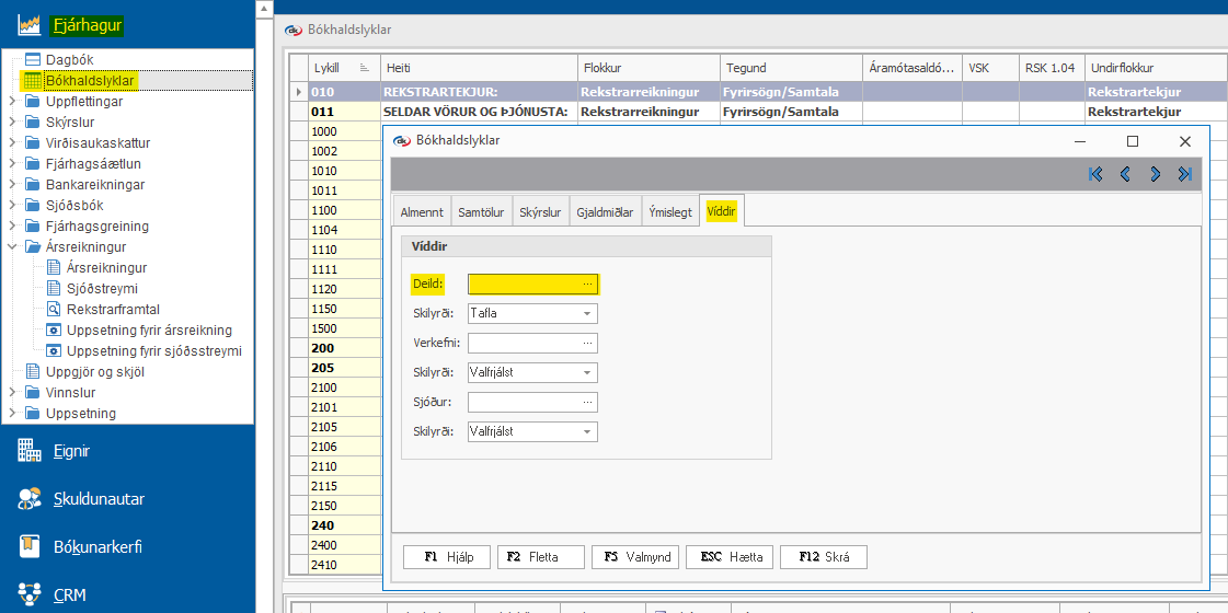 Fjárhagur > Bókhaldslyklar > Opna spjald bókhaldslykils > Víddir