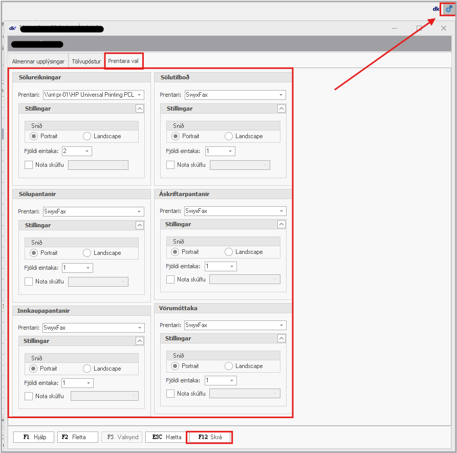 Leiðbeiningar fyrir stillingu prentara í DK bókhaldskerfinu