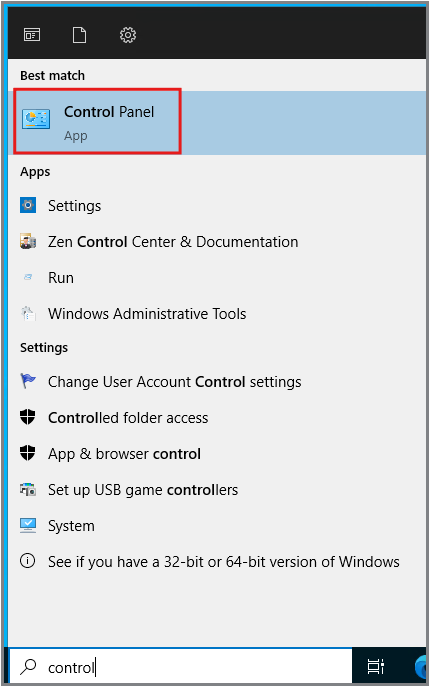 Skrifið Control í Search og þá eigið þið að fá upp appið: Control Panel, ýtið á það.