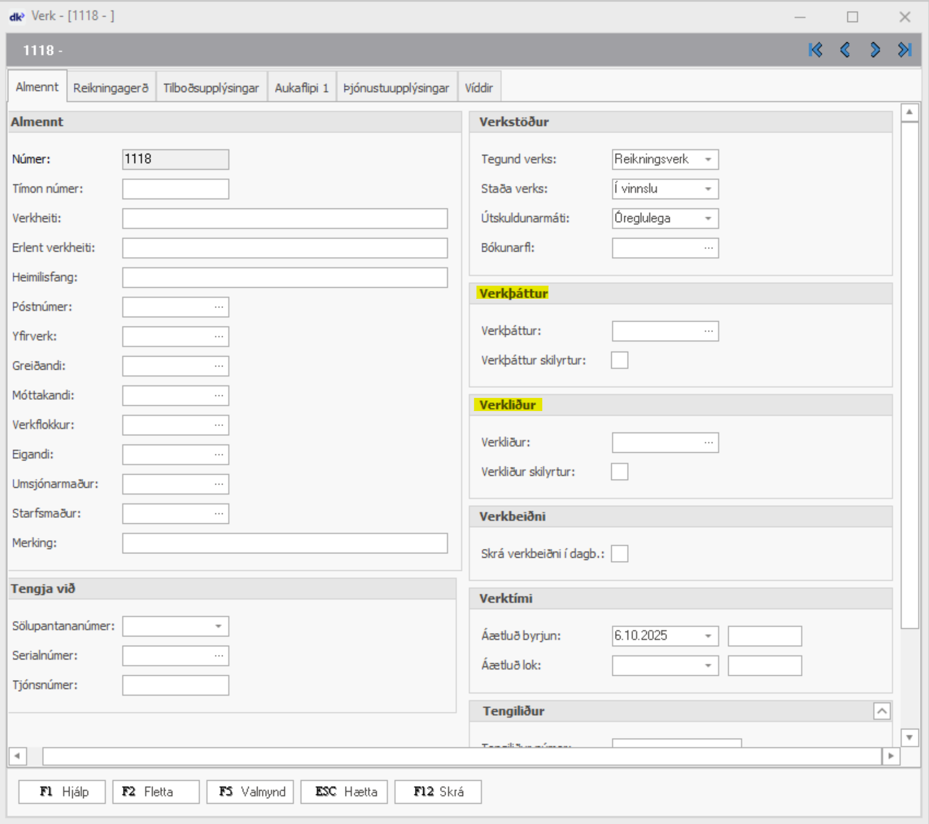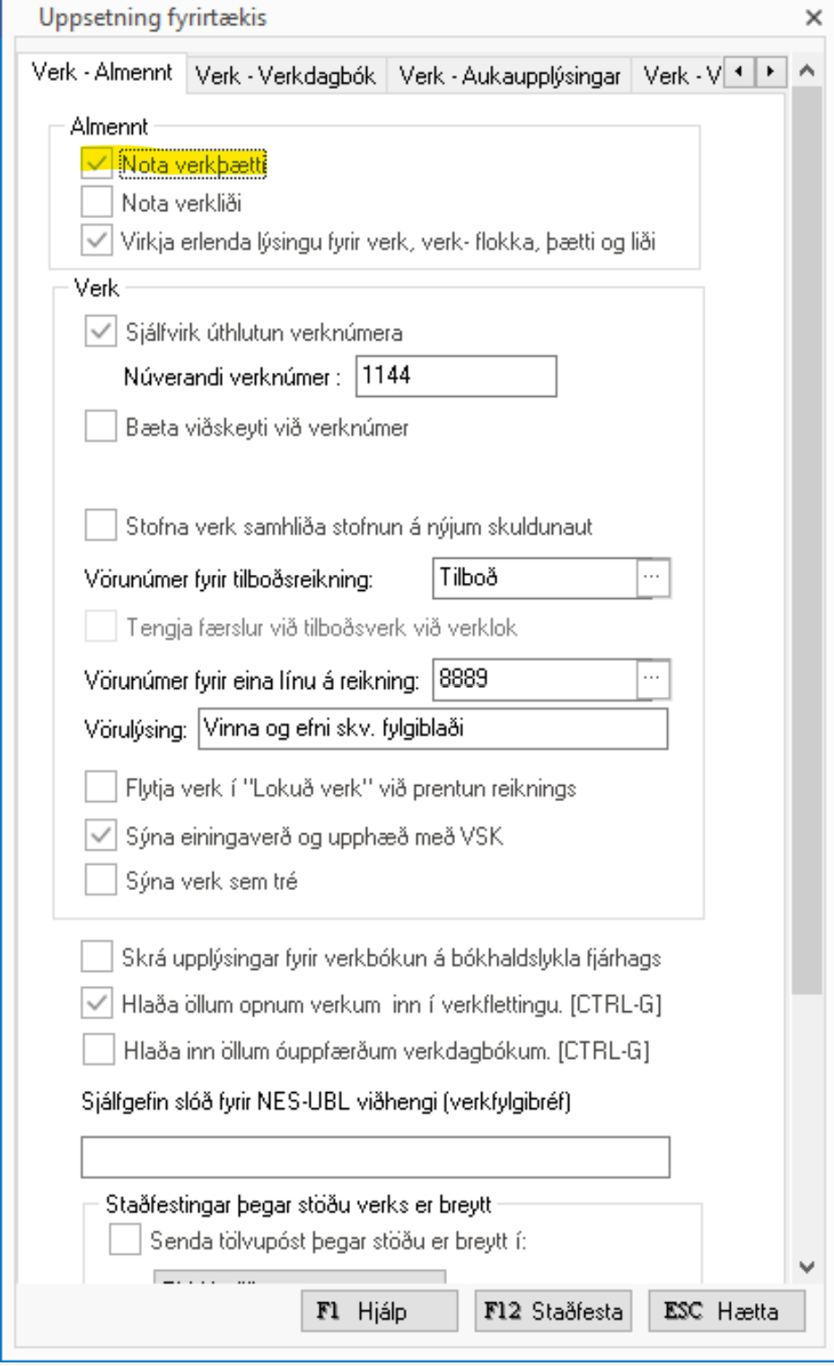 Ef notast á verkþætti eða verkliði þá þarf að fara undir Verk > Uppsetning > Almennar stillingar > Setja hak í "Nota verkþætti" eða "Nota verkliði" eða bæði