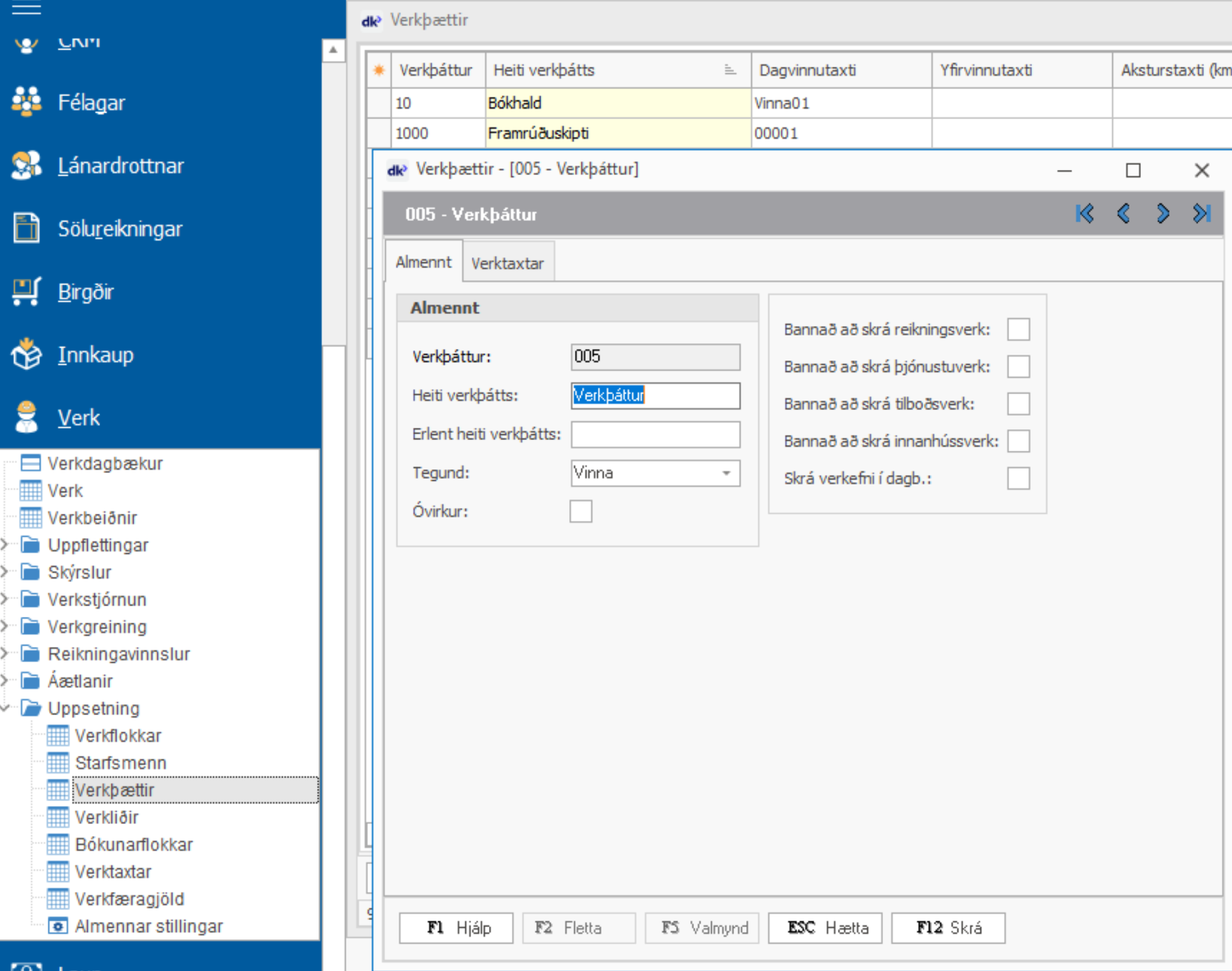 Hægt er að velja um að banna að skrá ákveðna verkþætti á ákveðna tegund af verkum.