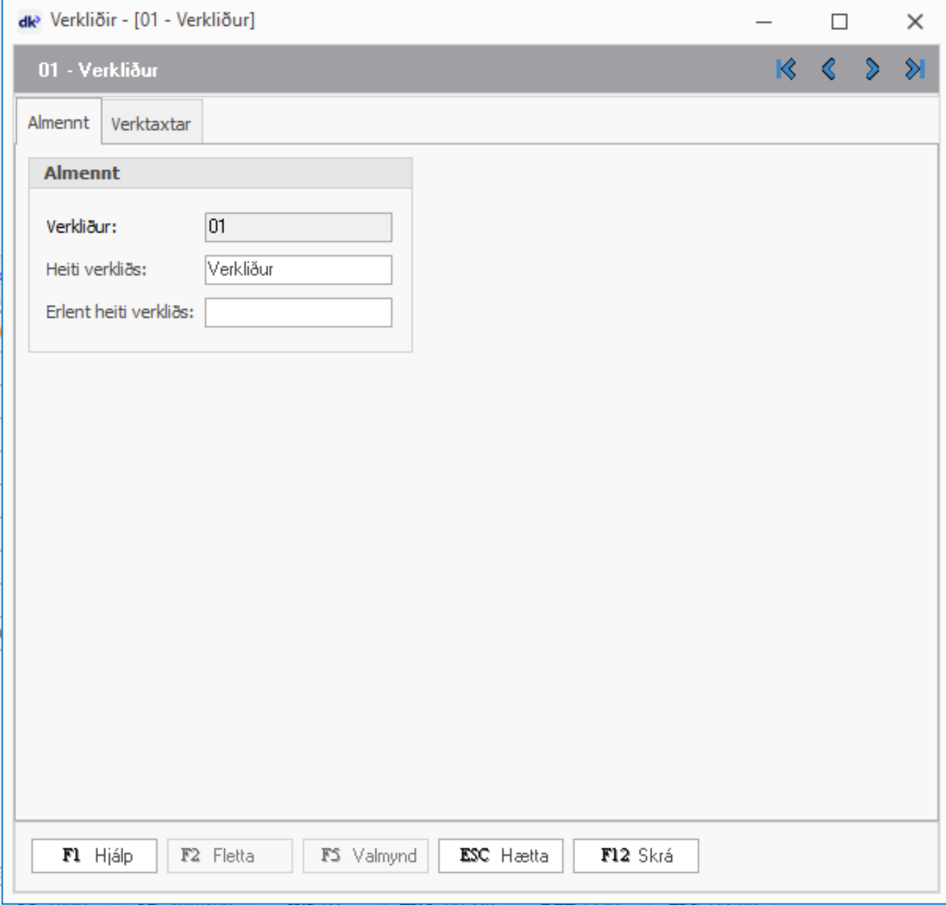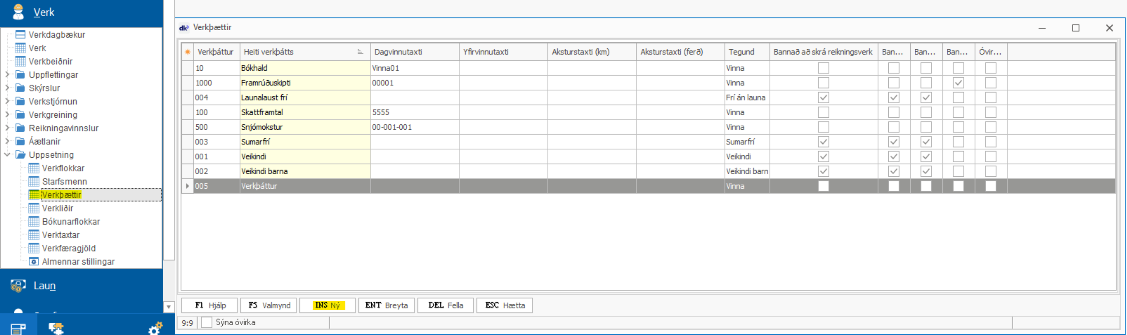 Verþáttur eða verkliður er stofnaður undir Verk > Uppsetning > Verkþáttur / Verkliður > INS ný