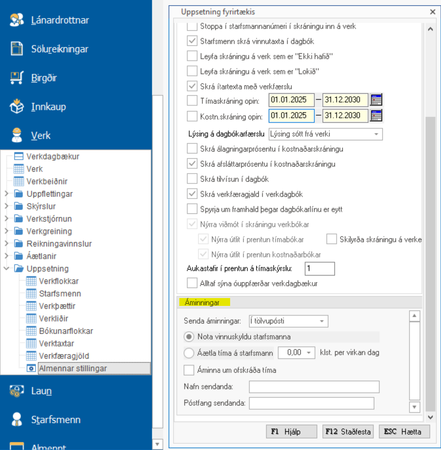 Uppsetningin er undir Verk > Uppsetning > Almennar stillingar > Verk - Verkdagbók