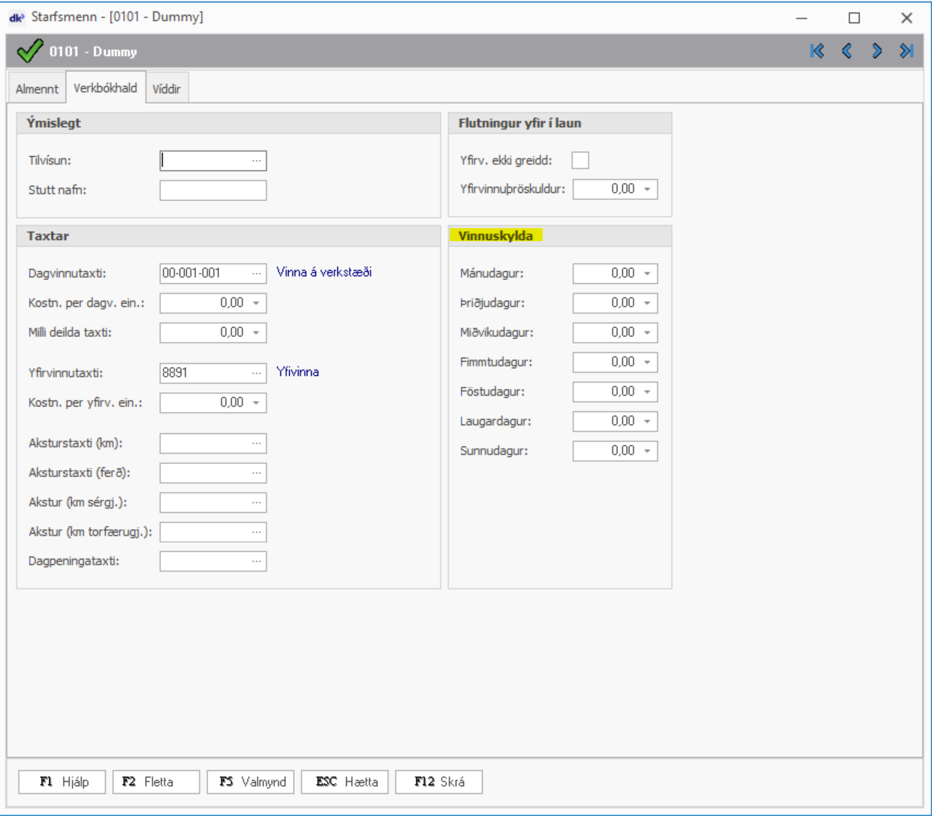 Vinnuskylda starfsmanna er stillt undir Verk > Uppsetning > Starfsmenn > Opna starfsmann > Verkbókhald