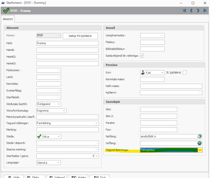 Breyta þarf á starfsmannaspjaldi - Tegund áminningu í "Tölvupóstur" og setja inn netfang sem senda á áminningu á.