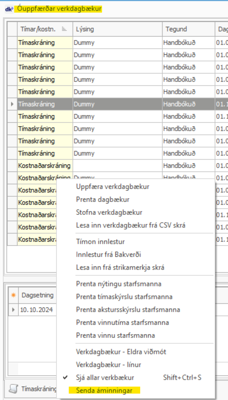 Senda þarf áminningu handvirkt undir Verk > Verkdagbækur > F5 valmynd > Senda áminningu