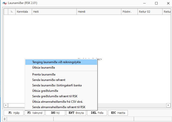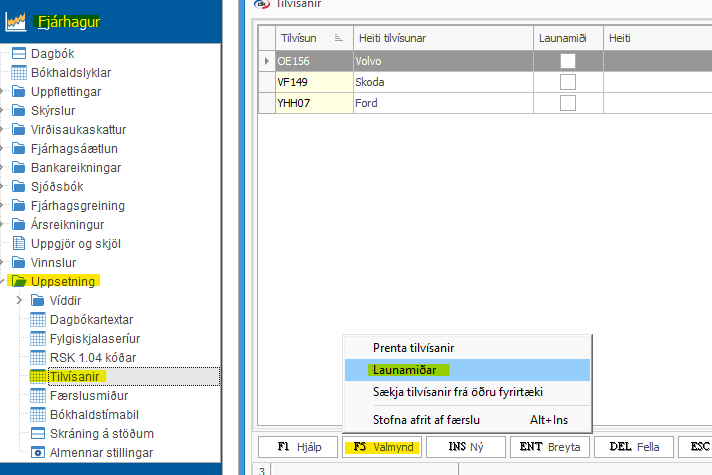 Fjárhagur > Uppsetning > Tilvísanir > F5 Valmynd > Launamiðar > F5 Valmynd > Tenging launamiða við reikningslykla