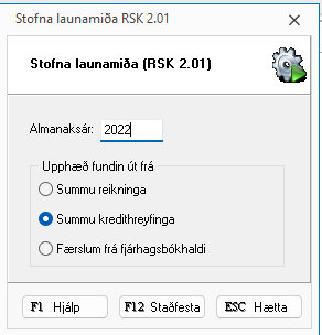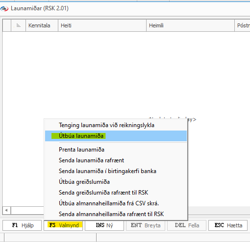 Fjárhagur > Uppsetning > Tilvísanir > F5 Valmynd > Launamiðar > F5 Valmynd > Útbúa launamiða