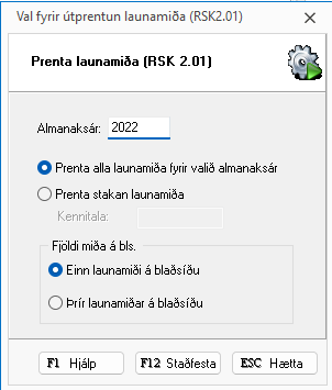 Fjárhagur > Uppsetning > Tilvísanir > F5 Valmynd > Launamiðar > F5 Valmynd > Prenta launamiða