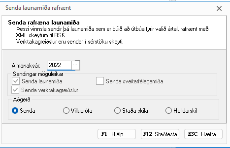 Fjárhagur > Uppsetning > Tilvísanir > F5 Valmynd > Launamiðar > F5 Valmynd > Senda launamiða rafrænt eða senda launamiða í birtingakerfi banka