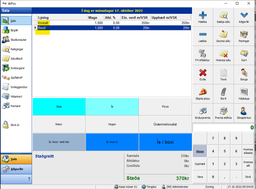 Til þess að virkja það að geta sett inn greiðslulínur á reikninga. Þá þarftu að virkja verslunareininguna (viðbót í áskrift) og tengja tölvuna við kassann þinn. Sölureikningar > Verslunareiningar > Kassar > Tvísmellir á kassann > Tengdar tölvur > INS ...