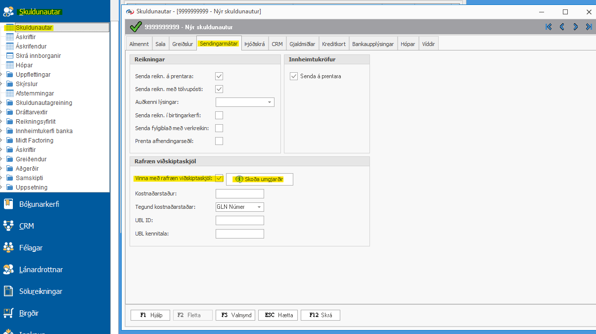 Ef hakið hverfur þá er skuldunautur ekki að móttaka rafræna reikninga. (Muna smella síðan á F12 Skrá)