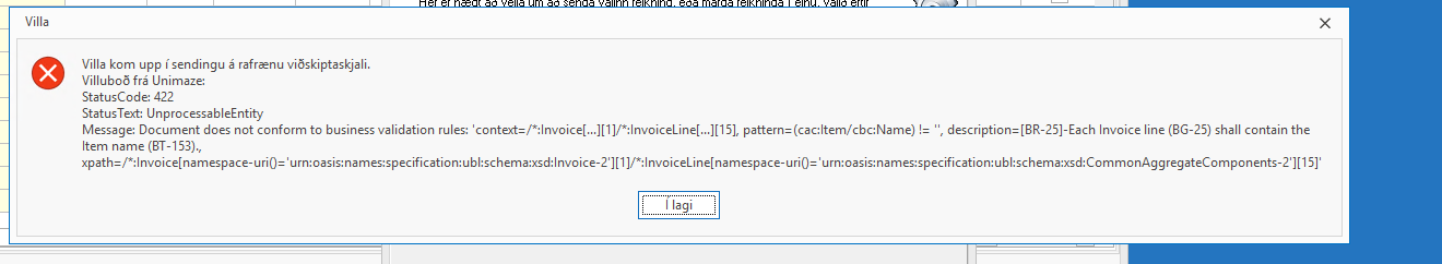 Ef þið fáið þessa villu þegar er verið að senda rafrænan reikning þá vantar vörulýsingu á sölureikninginn.. Til að reikningurinn fari rafrænt þá þarf að bakfæra reikninginn og stofna hann aftur, og setja inn vörulýsingu.