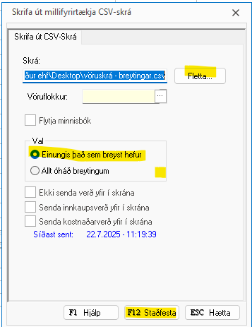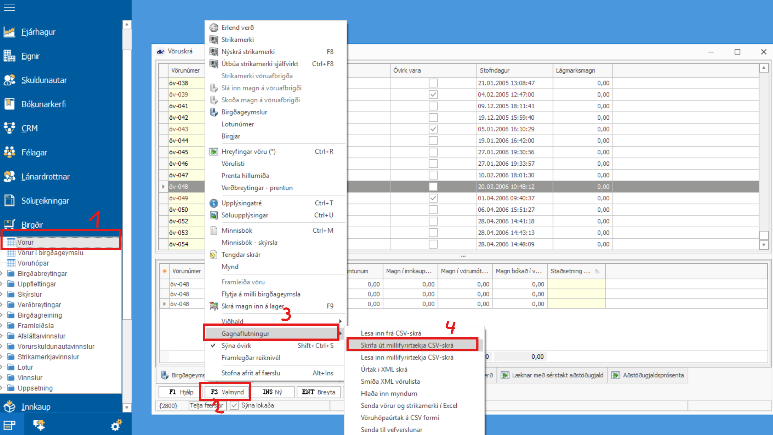 Birgðir → Vörur → F5 Valmynd → Gagnaflutningur → Skrifa út millifyrirtækja CSV-skrá