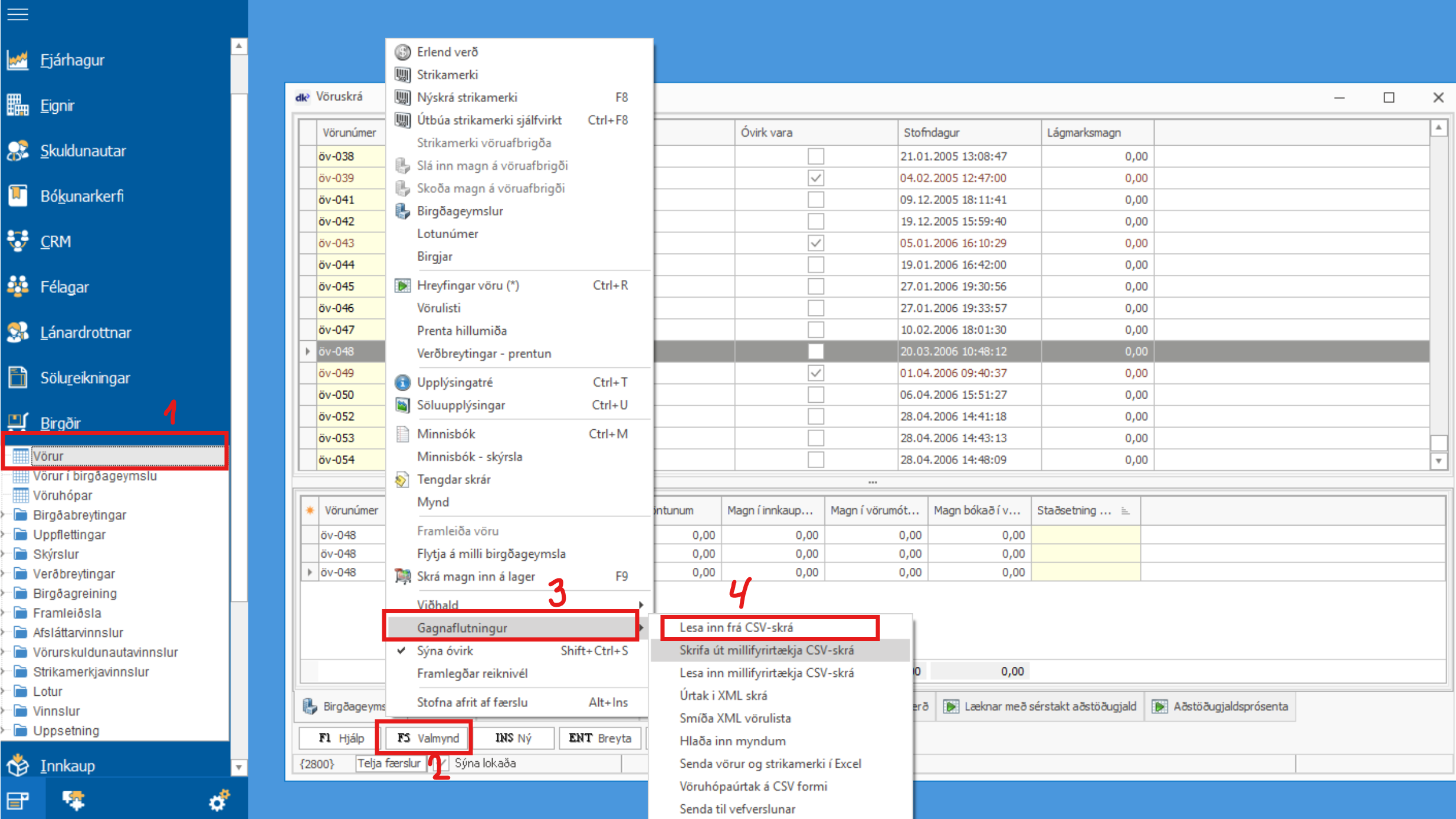 Birgðir → Vörur → F5 Valmynd → Gagnaflutningur → Lesa inn frá CSV-skrá
