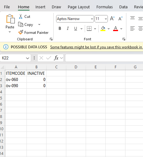 Opna skjalið. Eyða öllum dálkum út nema "ITEMCODE".