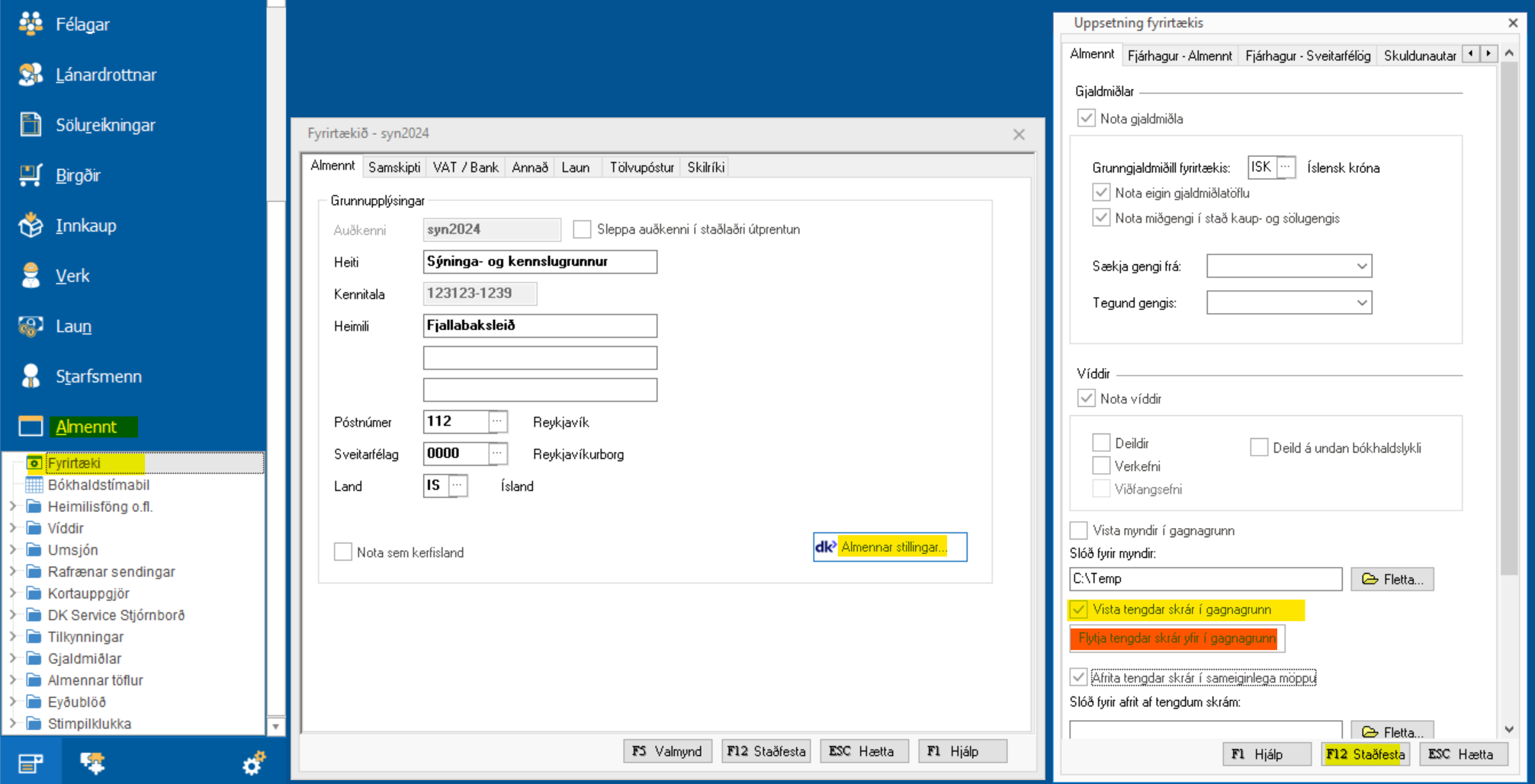 Ef vista á öll viðhengi og aðrar tengdar skrár í gagnagrunn, í stað þess að skjölin séu bundin við slóð á drifi o.þ.h., þá er hægt að fara undir Almennt > Fyrirtæki > Almennar stillingar > Haka í "Vista tengdar skrár í gagnagrunn". Öll skjöl sem tengd eru við færslur og reikninga eftir að þessu haki er bætt við eru vistuð í gagnagrunn.